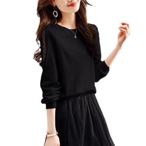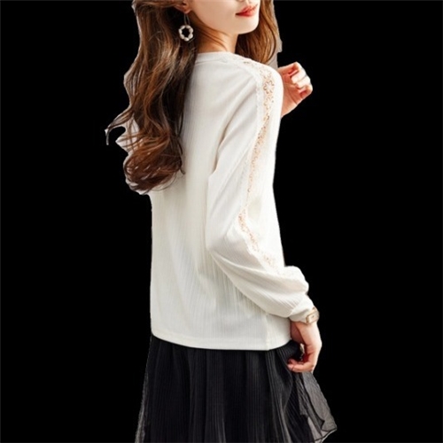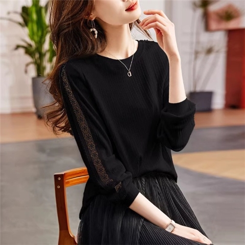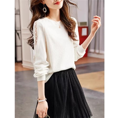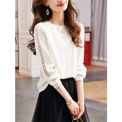 圆领镂空蕾丝肌理感上衣女式T2024春季新款时尚气质针织长袖T恤