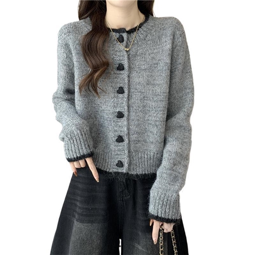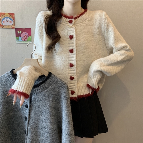KANING拼色爱心纽扣针织开衫女2025早春新款慵懒风软糯毛衣外套女