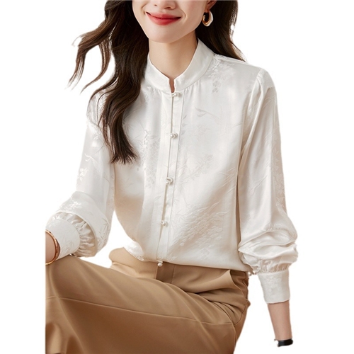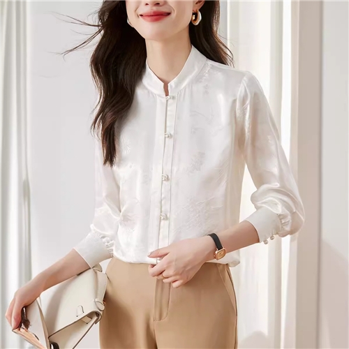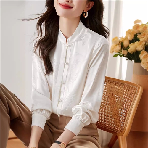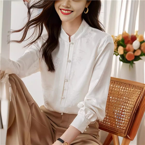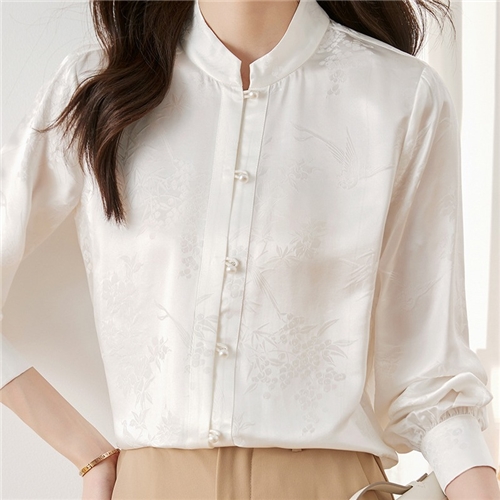 实拍春季中国风复古花鸟提花气质新中式小立领珍珠扣缎面长袖衬衫
