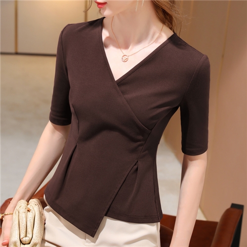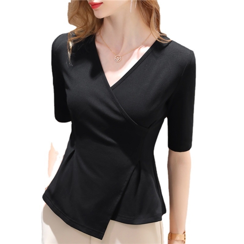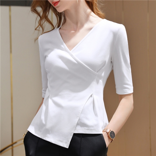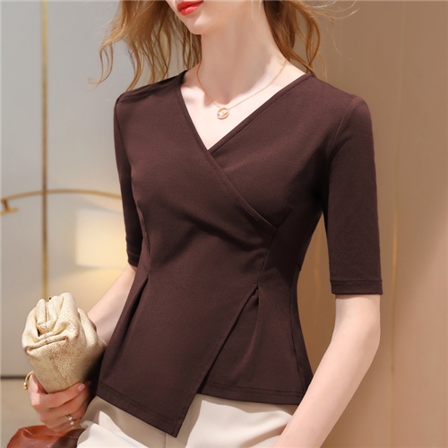 中袖t恤女2023新款女装v领洋气打底衫收腰内搭不对称小众别致上衣