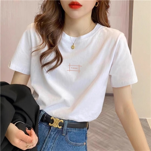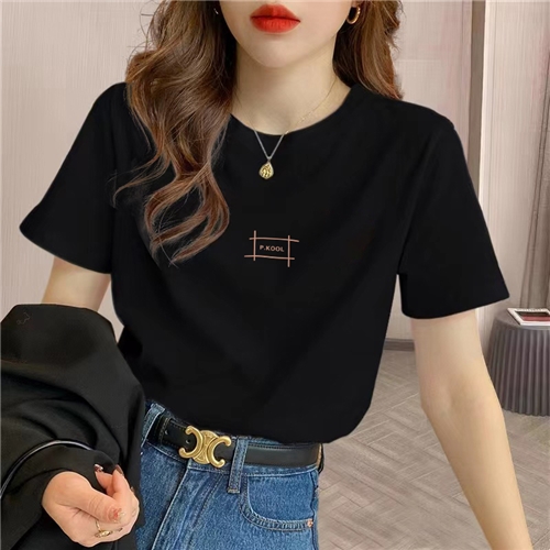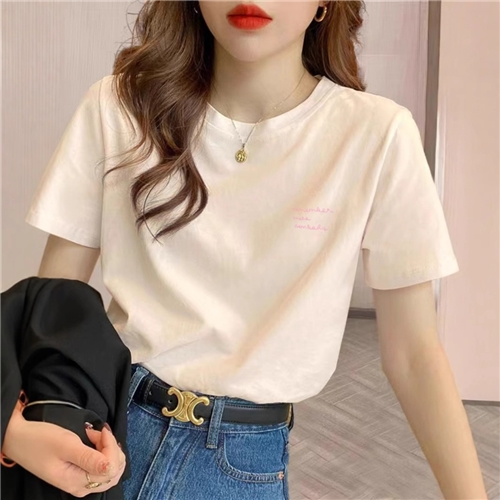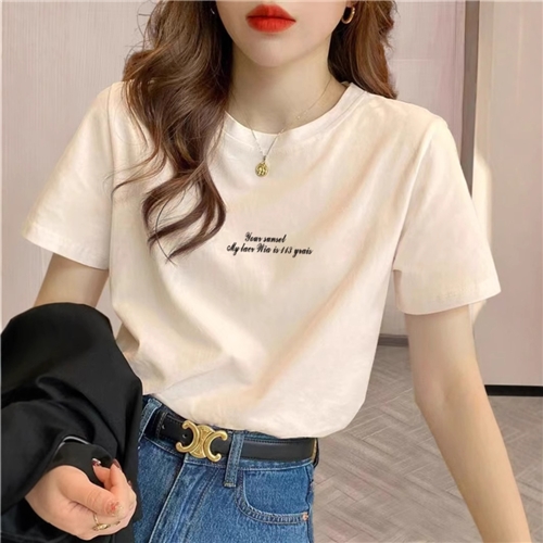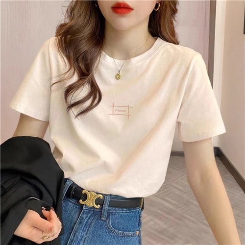 2025新款正肩纯棉短袖t恤女字母印花百搭洋气宽松杏色体恤衫夏季